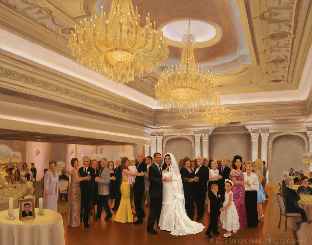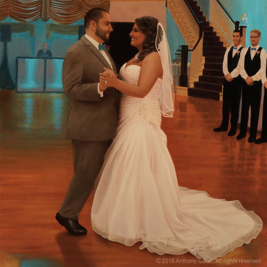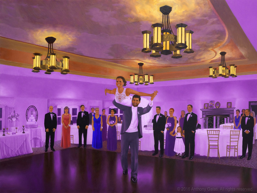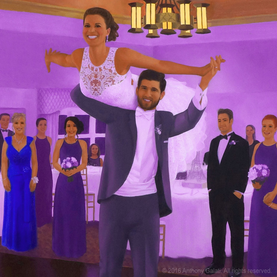 The painting will be finished after the event when I add in specifically recognizable faces of the married couple as well as various other details of the scene. The rest of the people in the painting will have a slightly more impressionistic look. When it’s complete, you will have a new family heirloom to hang on the wall to remember your special day. Past clients have said that my paintings captured the feeling of the night better than any of the photos.