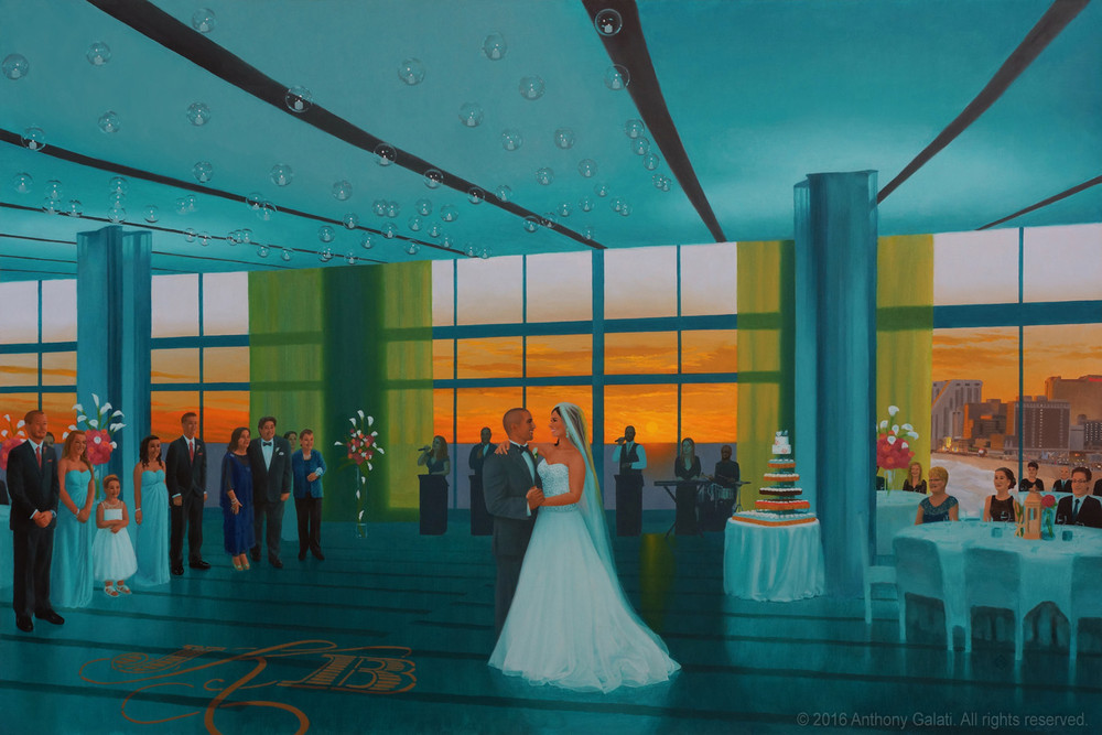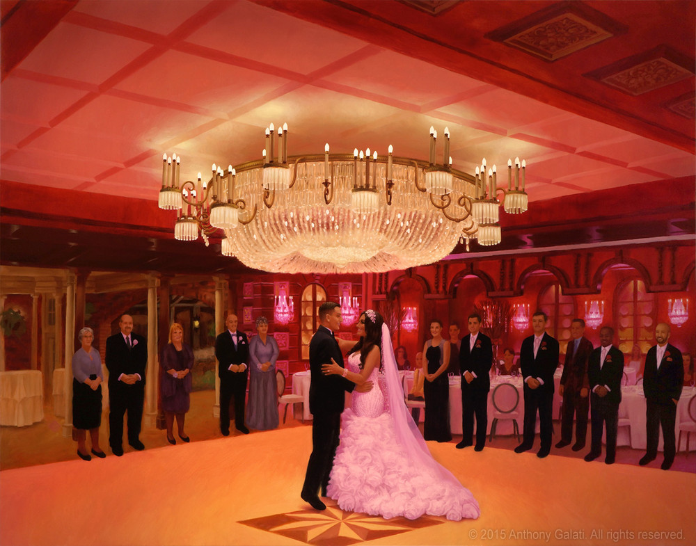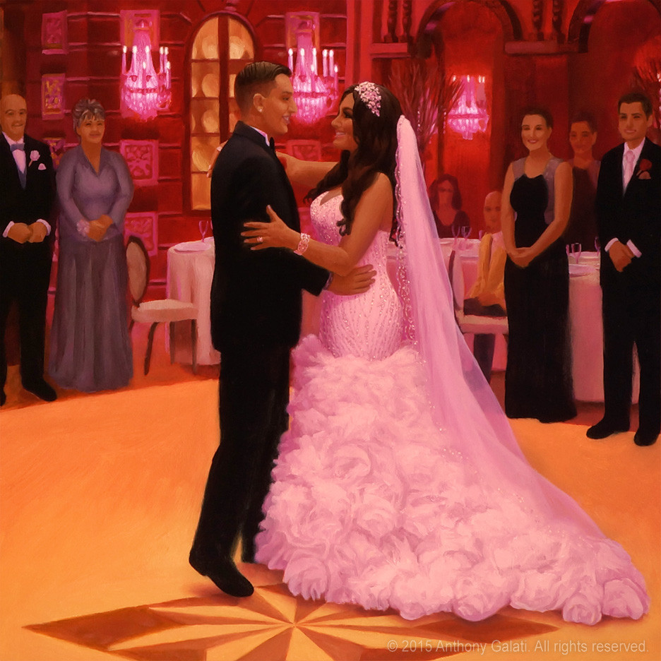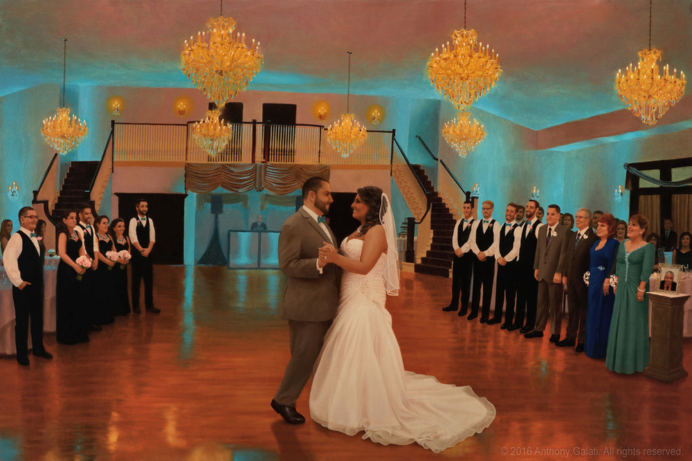 The painting will be finished after the event when I add in specifically recognizable faces of the married couple as well as various other details of the scene. The rest of the people in the painting will have a slightly more impressionistic look. When it’s complete, you will have a new family heirloom to hang on the wall to remember your special day. Past clients have said that my paintings captured the feeling of the night better than any of the photos.